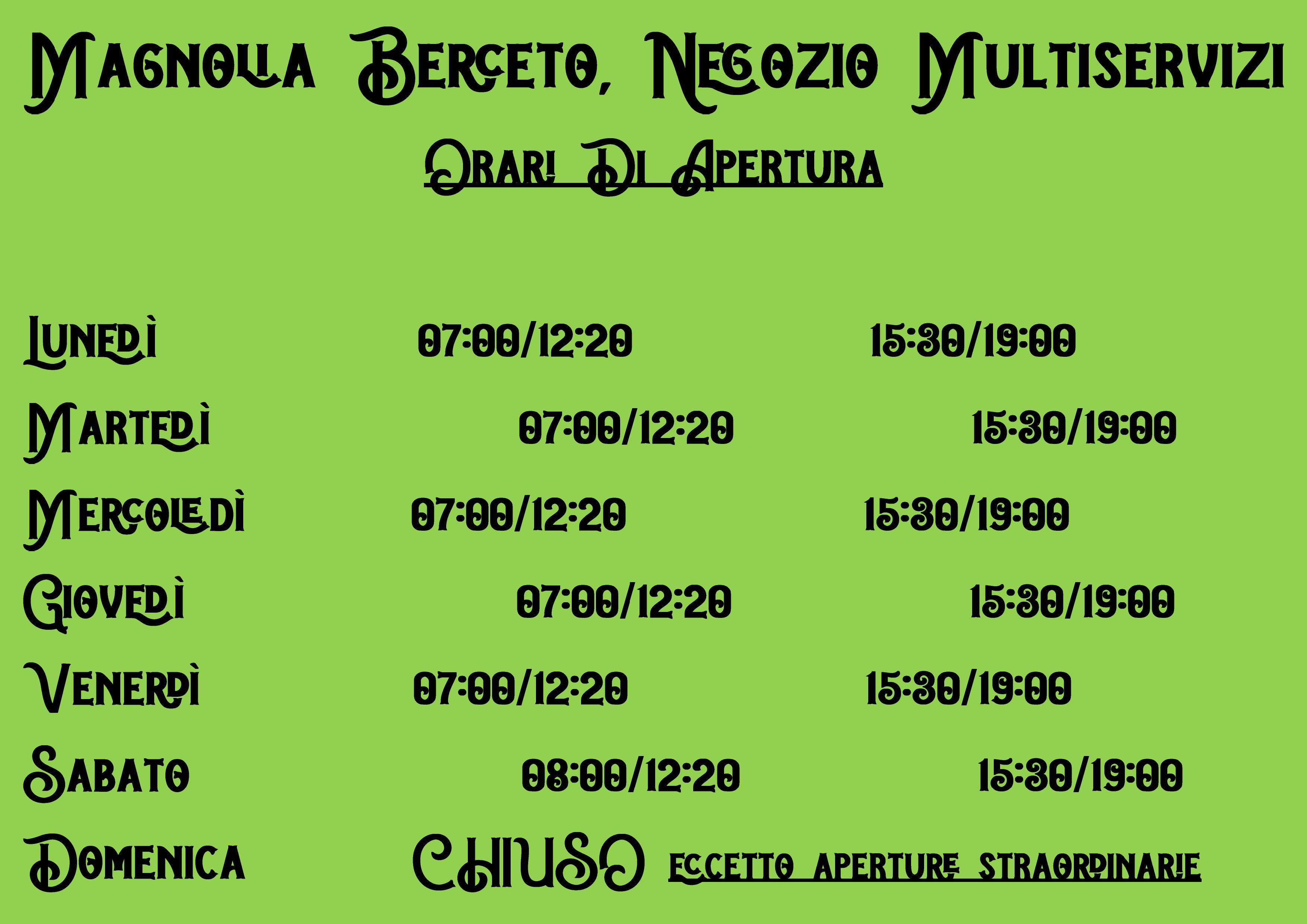 Siamo aperti dal lunedì al sabato e in Luglio e Agosto anche di domenica.